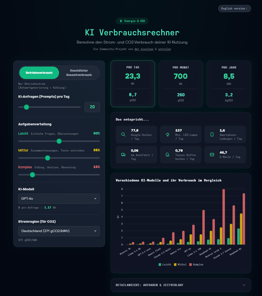 Entdecke meinen KI-Verbrauchsrechner (ki-verbrauchsrechner.de): Berechne Stromverbrauch & CO₂ von KI-Anfragen inkl. Training/Server. Englisch: ai-consumption.com. Transparente FAQ für bewusste KI-Nutzung aus Köln/Bonn.