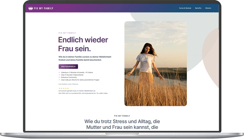 Die Landingpage fixmyfamily.de wurde in kurzer Zeit als verkaufsstarke Lösung für Philip Bandholtz umgesetzt – Vatercoach Nr. 1 in Deutschland. Ziel: Interessent:innen schnell überzeugen, Vertrauen aufbauen und direkt zur Buchung führen. Schlank, sauber, mit moderner Optik und dezenten Effekten, ohne überflüssigen Schnickschnack.